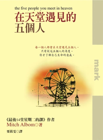 《在天堂遇見的五個人》中的主角艾迪在83歲生日那天,剛好在遊樂場遇上一場意外,最後他為了拯救一名小女孩而不幸喪生。當他醒來後,發現自己已經身處天堂。而在天堂上,艾迪遇上了曾經出現在他生命裡的五個人,這五個人分別讓他,也讓讀者重新上了人生裡最重要的其中五堂課:世事都是緊扣著、選擇與犧牲、寬恕、愛,活著的意義。